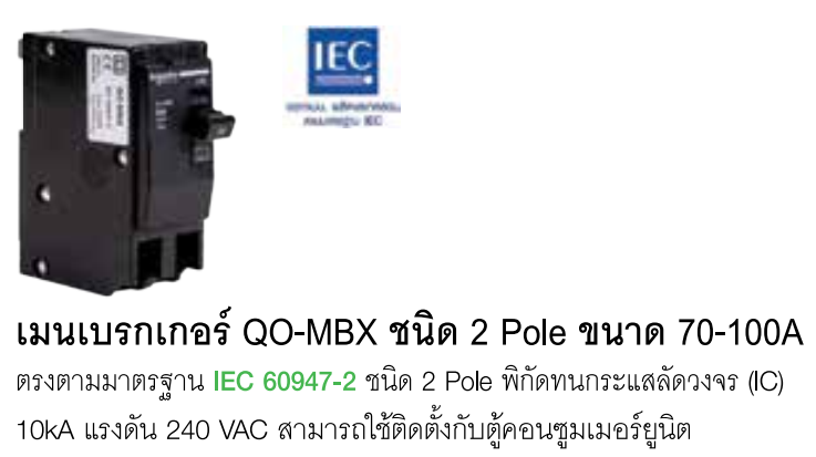 The QO-MBX 2-Pole main circuit breaker is engineered for higher current requirements, available in 80 A and 100 A ratings. It is manufactured in compliance with the IEC 60947-2 standard, providing a rated breaking capacity (Icu) of 10 kA at 240 VAC.