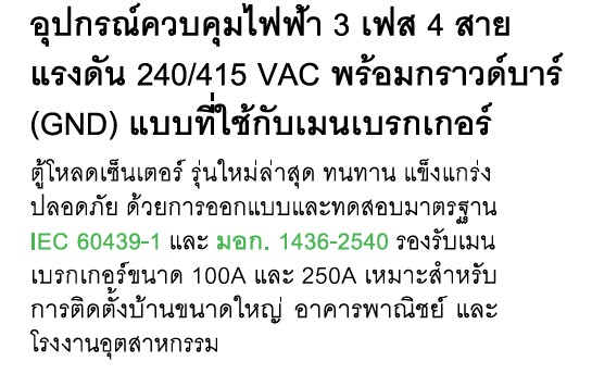 The latest load center series is designed for durability, strength, and safety, tested in accordance with IEC 60439-1 and TIS 1436-2540 standards. It supports main breaker ratings of 100 A and 250 A, making it ideal for installation in large residential properties, commercial buildings, and industrial facilities.